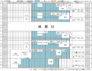 2月16日~2月22日のコース予定表
