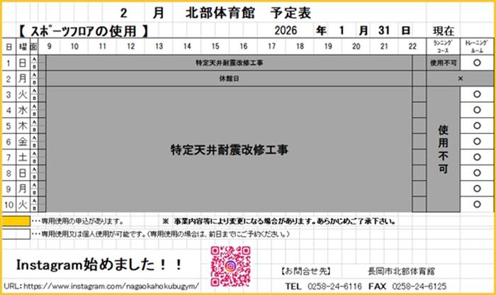 令和8年1月20日~31日の予定表 こんにちは.令和8年1月20日~31日までの予定表です.予定が変更になる場合がありますので、確実に利用したい方はお問い合わせください.現在「特定天井耐震改修工事」が実施されております。トレーニングルームにつきましては利用可能ですが、スポーツフロア及びランニングコースは、工事完了までご利用できません.ご不便をおかけいたしますが、何卒、ご理解とご協力をお願いいたします.長岡市北部体育館0258-24-6116.