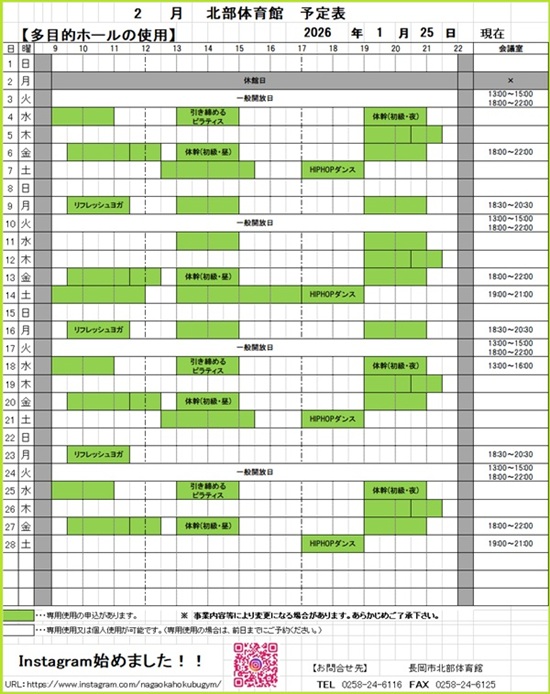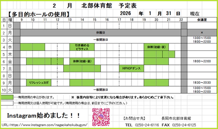 令和8年2月の予定表 こんにちは令和8年2月の予定表です.予約が変更になる場合がありますので、確実に利用したい方はお問合せください.現在、「特定天井耐震改修工事」が実施されております。トレーニングルームにつきましては利用可能ですが、スポーツフロアおよびランニングコースは工事完了までご利用できません.ご不便をおかけいたしますが何卒、ご理解ご協力をお願いいたします.長岡市北部体育館0258-24-6116.