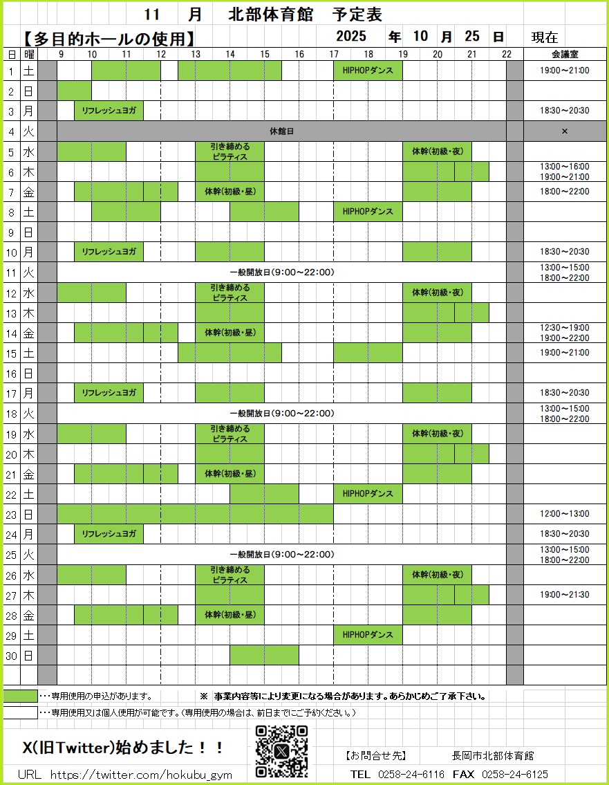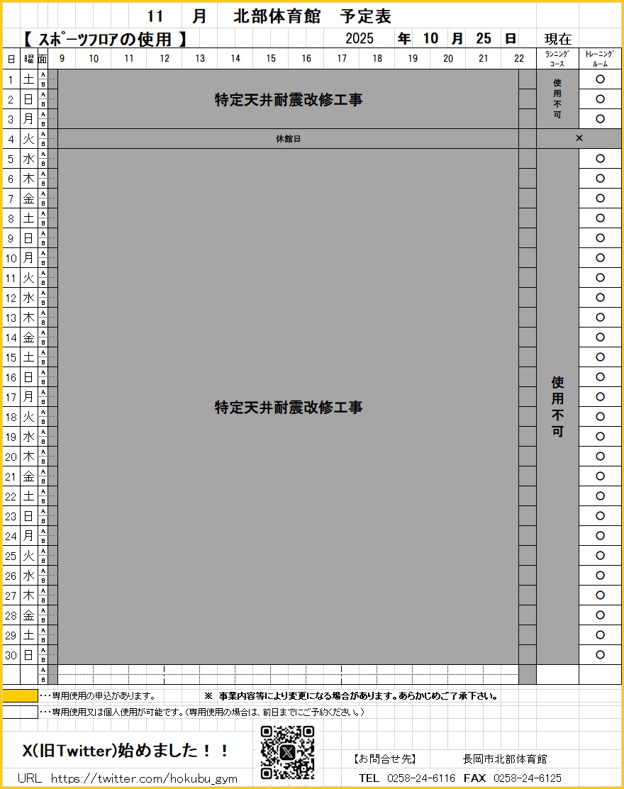 令和7年11月の予定表 こんにちは令和7年11月の予定表です.予約が変更になる場合がありますので、確実に利用したい方はお問合せください.現在、「特定天井耐震改修工事」が実施されております。トレーニングルームにつきましては利用可能ですがスポーツフロアおよびランニングコースは工事完了までご利用できません。.ご不便をおかけいたしますが何卒、ご理解ご協力をお願いいたします。.長岡市北部体育館0258-24-6116. « 工事期間延長のお知らせ