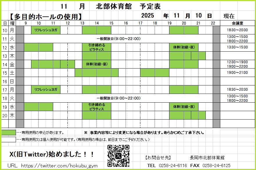 令和7年11月10日~20日の予定表 こんにちは令和7年11月10日~20日の予定表です予約が変更になる場合がありますので、確実に利用したい方はお問合せください.現在、「特定天井耐震改修工事」が実施されております。トレーニングルームにつきましては利用可能ですがスポーツフロアおよびランニングコースは工事完了までご利用できません。.ご不便をおかけいたしますが何卒、ご理解ご協力をお願いいたします。.長岡市北部体育館0258-24-6116. « 令和7年11月1日~10日の予定表