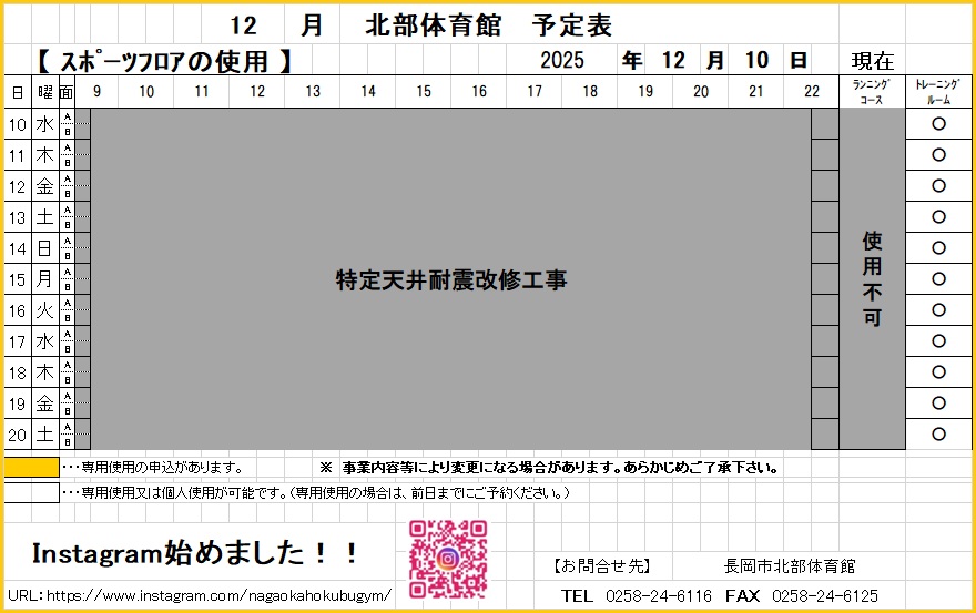 スポーツフロアおよびランニングコースは、工事完了までご利用できません