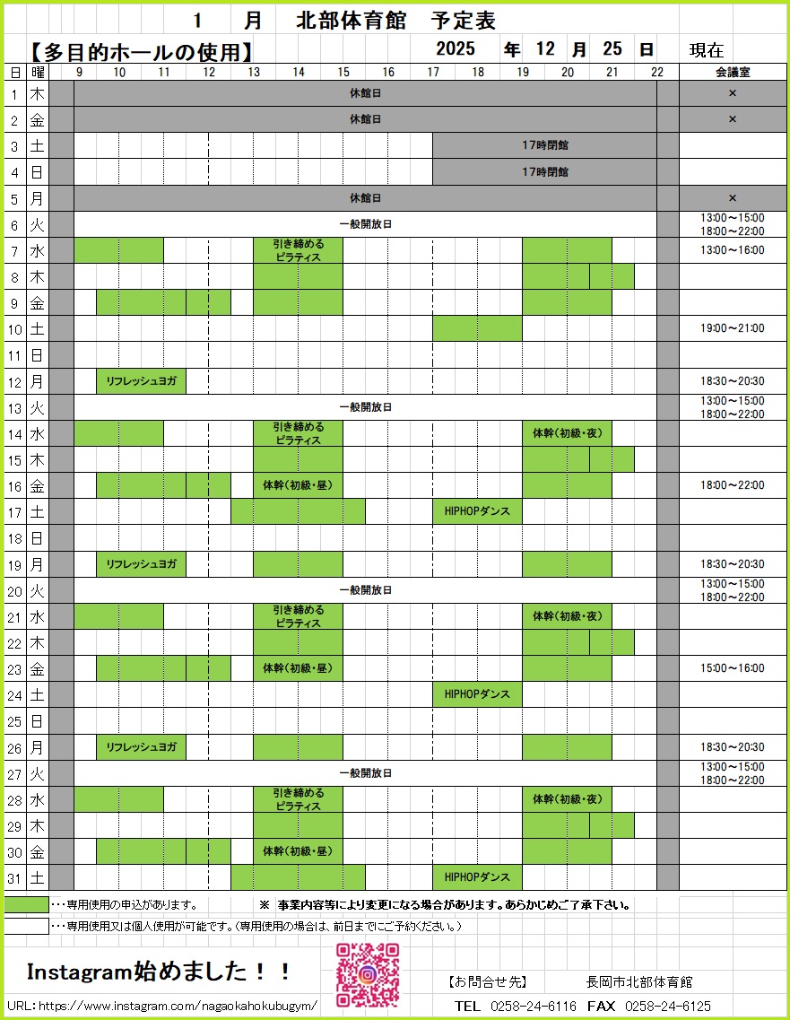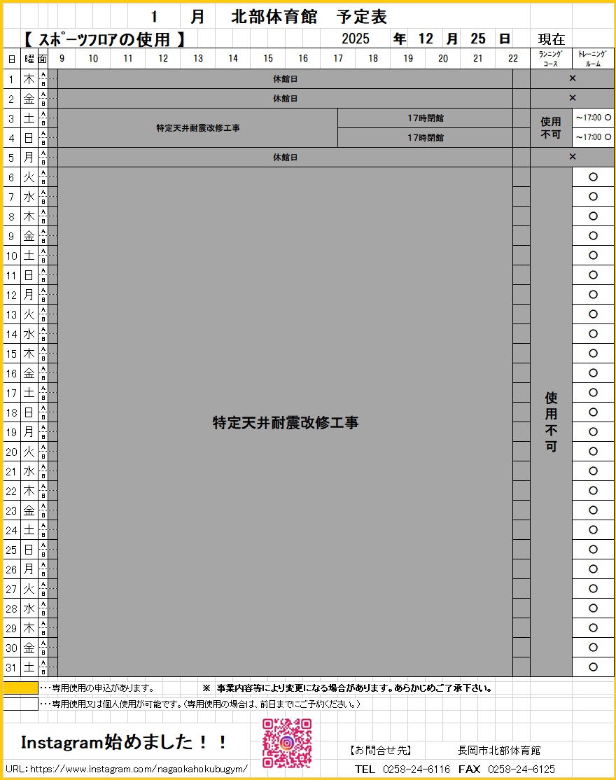 令和8年1月の予定表 こんにちは令和8年1月の予定表です.予約が変更になる場合がありますので、確実に利用したい方はお問合せください.現在、「特定天井耐震改修工事」が実施されております。トレーニングルームにつきましては利用可能ですが、スポーツフロアおよびランニングコースは工事完了までご利用できません.ご不便をおかけいたしますが何卒、ご理解ご協力をお願いいたします.長岡市北部体育館0258-24-6116. « 令和7年12月20日~31日の予定表