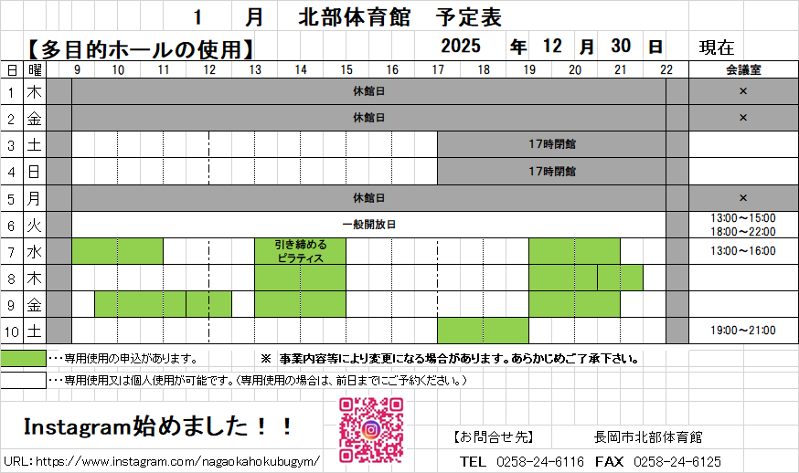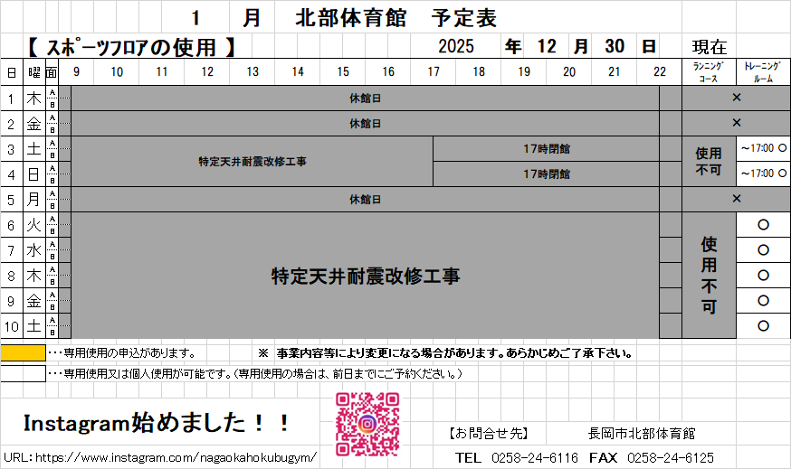 令和8年1月1日~10日の予定表 こんにちは令和8年1月1日~10日の予定表です予定が変更になる場合がありますので、確実に利用したい方はお問合せください 現在、「特定天井耐震改修工事」が実施されております。トレーニングルームにつきましては利用可能ですがスポーツフロアおよびランニングコースは工事完了までご利用できません。 ご不便をおかけいたしますが何卒、ご理解ご協力をお願いいたします。 長岡市北部体育館0258-24-6116 « 令和8年1月の予定表