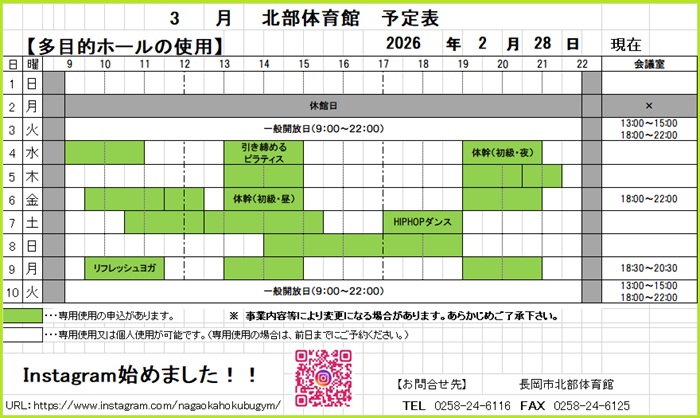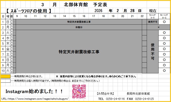 令和8年3月1日~10日の予定表 こんにちは.令和8年3月1日~10日までの予定表です.予定が変更になる場合がありますので、確実に利用したい方はお問い合わせください.現在「特定天井耐震改修工事」が実施されております。トレーニングルームにつきましては利用可能ですが、スポーツフロア及びランニングコースは、工事完了までご利用できません.ご不便をおかけいたしますが、何卒、ご理解とご協力をお願いいたします.長岡市北部体育館0258-24-6116. « 令和8年3月の予定表