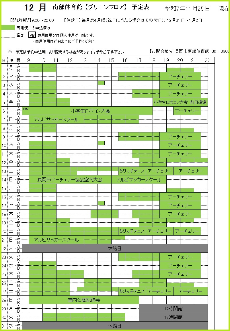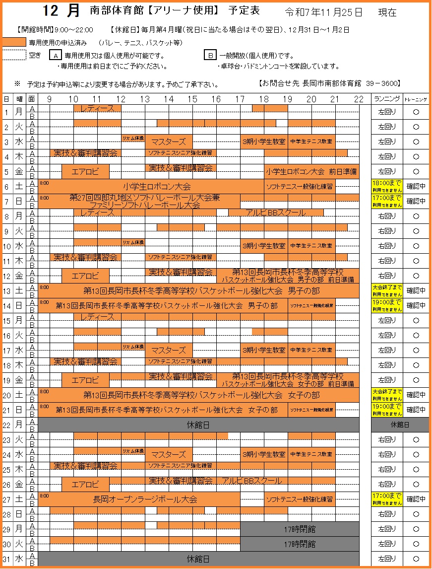 令和7年12月の予定表【令和7年12月の予定表】.こんにちは.令和7年12月の予定表をアップします.予約は前日まで受け付けているため、予定表通りに空いていない場合があります.最新の空き状況につきましては、電話または窓口でお問い合わせください.アリーナ・グリーンフロアの空き状況は、X(旧:Twitter)で毎日投稿しております.長岡市南部体育館0258-39-3600.#長岡市 #南部体育館 #予定表 ツイート