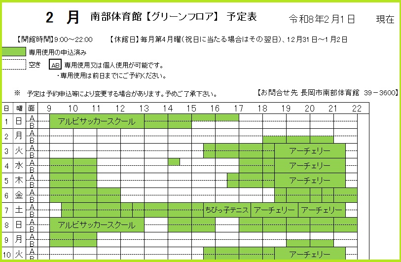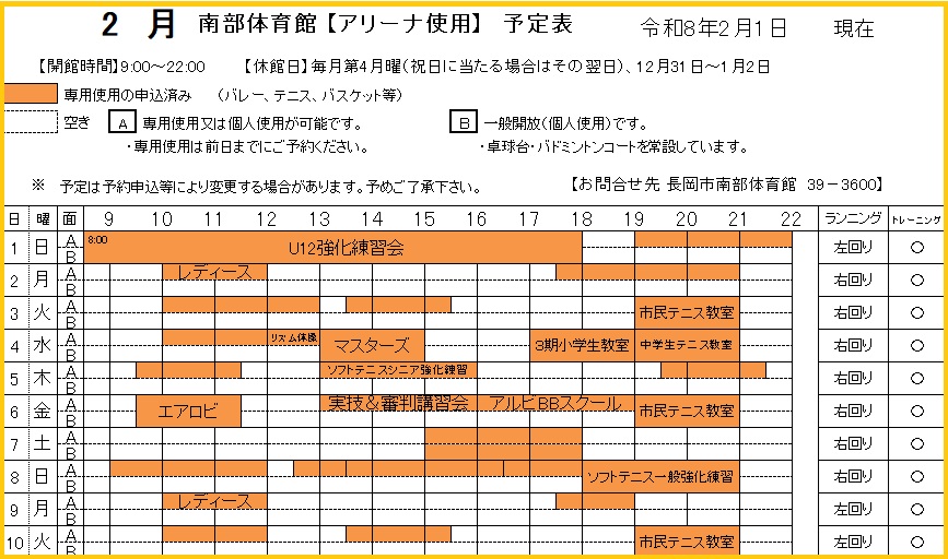 令和8年2月1日~10日の予定表【週間予定表】.こんばんは☆.令和8年2月1日〜10日の予定表をアップします.予約は前日まで受け付けているため、予定表通りに空いていない場合があります.最新の空き状況につきましては、電話または窓口でお問い合わせください.アリーナ・グリーンフロアの空き状況は、X(旧:Twitter)で毎日投稿しております.長岡市南部体育館0258-39-3600.#長岡市 #南部体育館 #予定表 ツイート