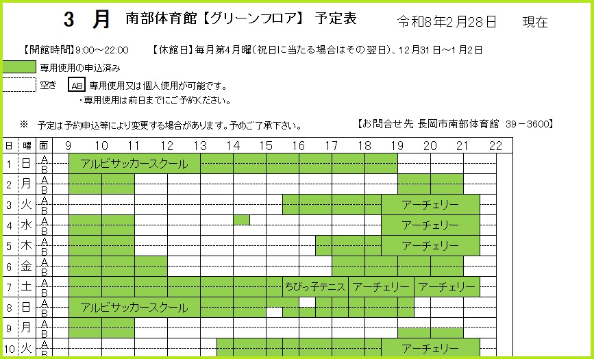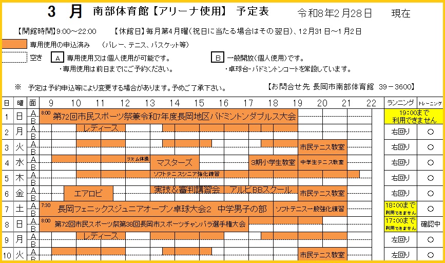 令和8年3月1日~10日の予定表【週間予定表】.こんばんは.令和8年3月1日〜10日の予定表をアップします.予約は前日まで受け付けているため、予定表通りに空いていない場合があります.最新の空き状況につきましては、電話または窓口でお問い合わせください.アリーナ・グリーンフロアの空き状況は、X(旧:Twitter)で毎日投稿しております.長岡市南部体育館0258-39-3600.#長岡市#長岡市南部体育館#運動#予定表 ツイート