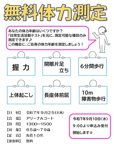 当館では、高齢者を対象とした無料体力測定会を開催します😊